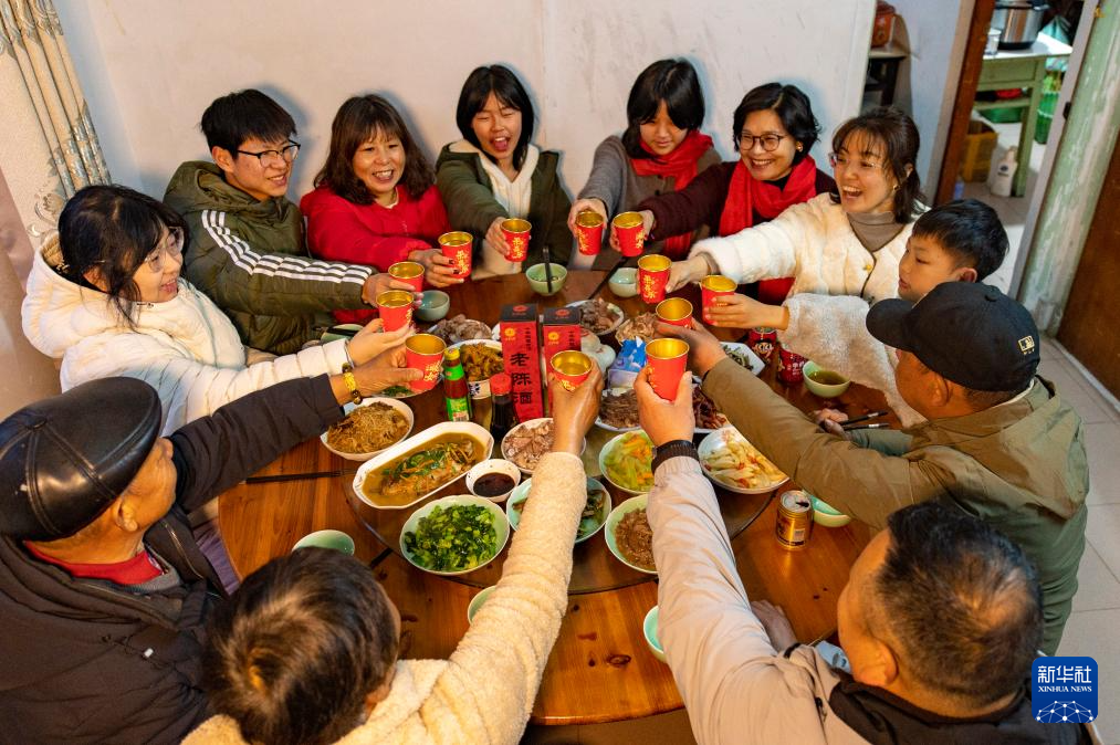 2月16日,浙江省永康市花街镇山后胡村的一家人在吃年夜饭。